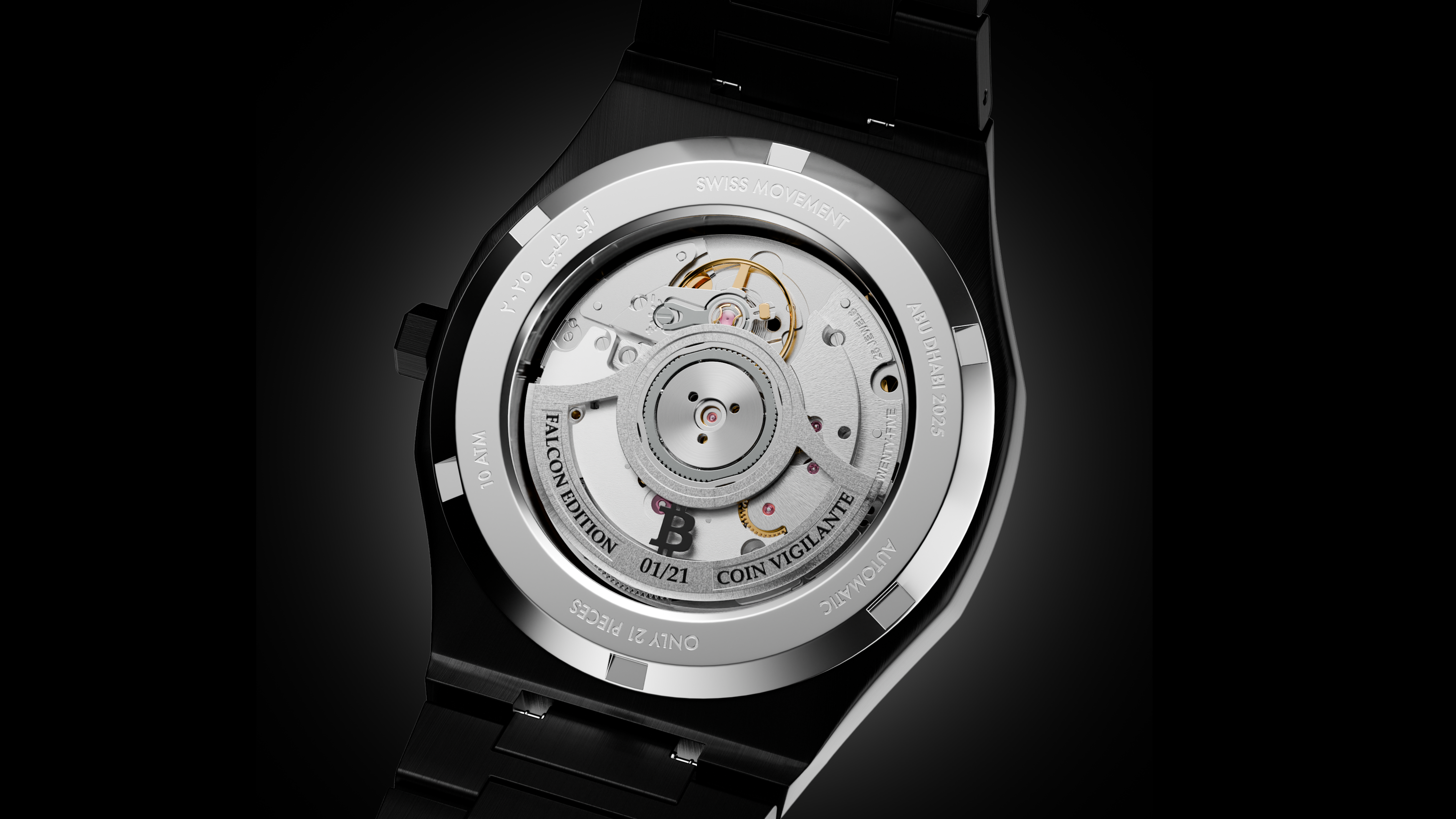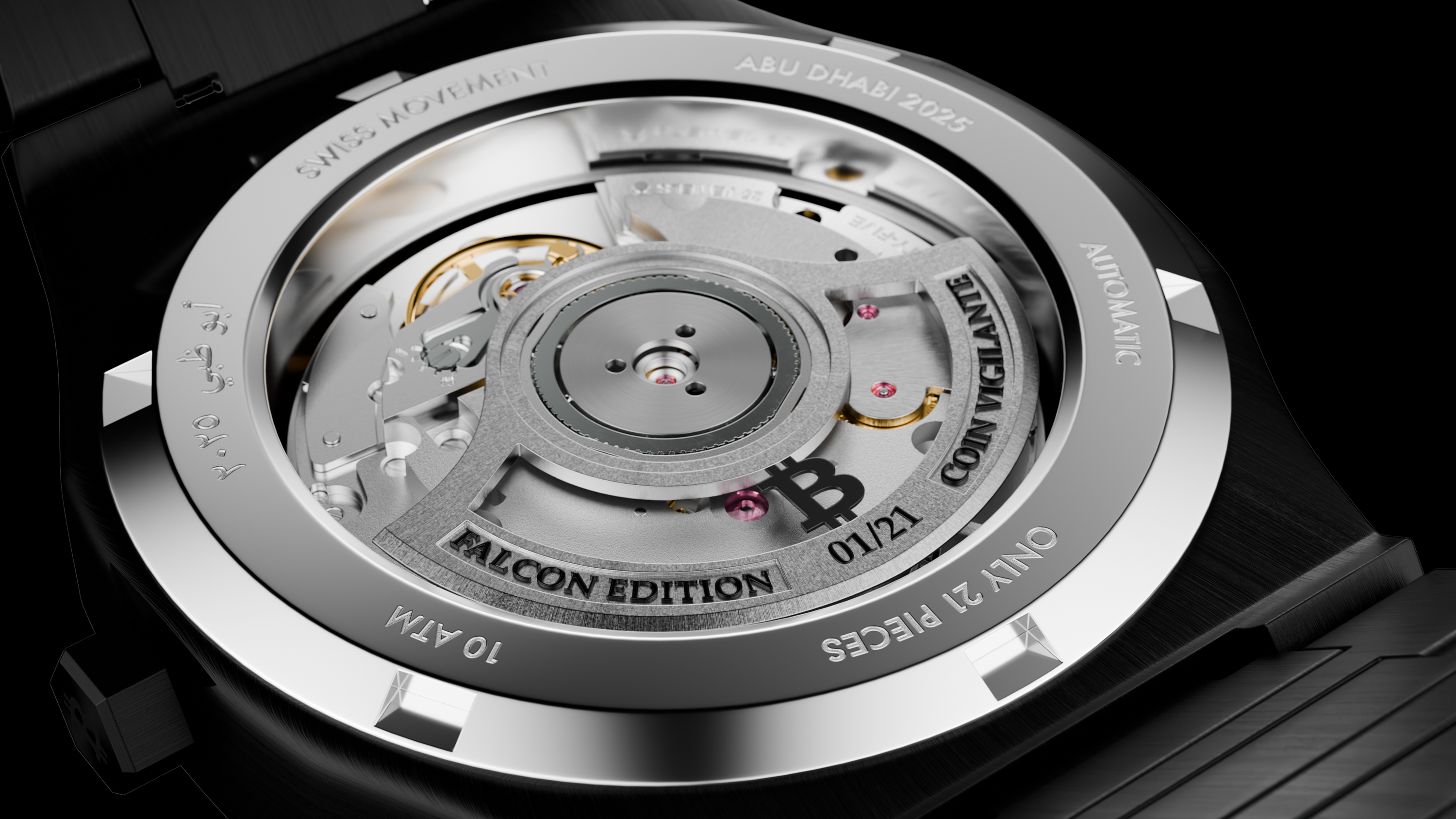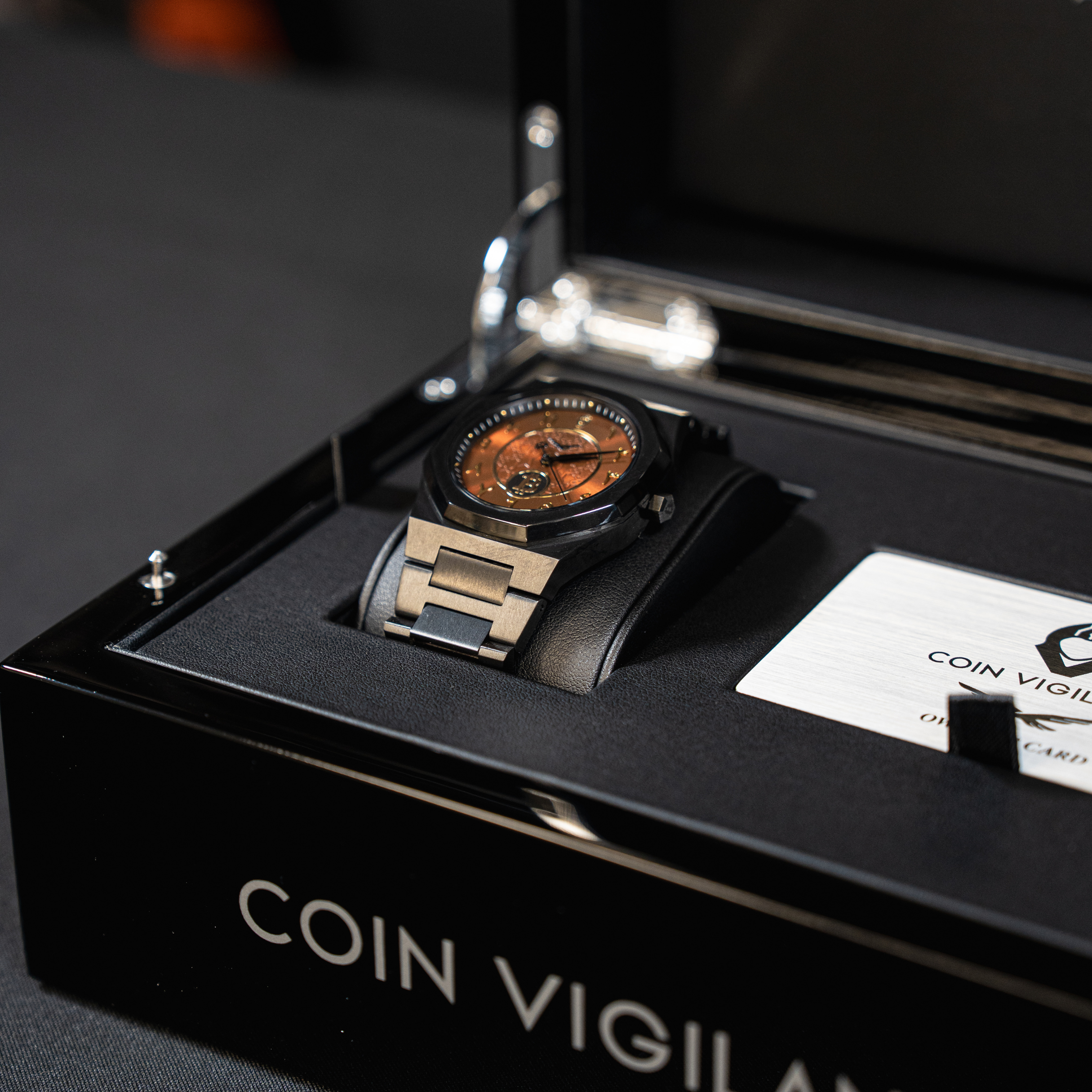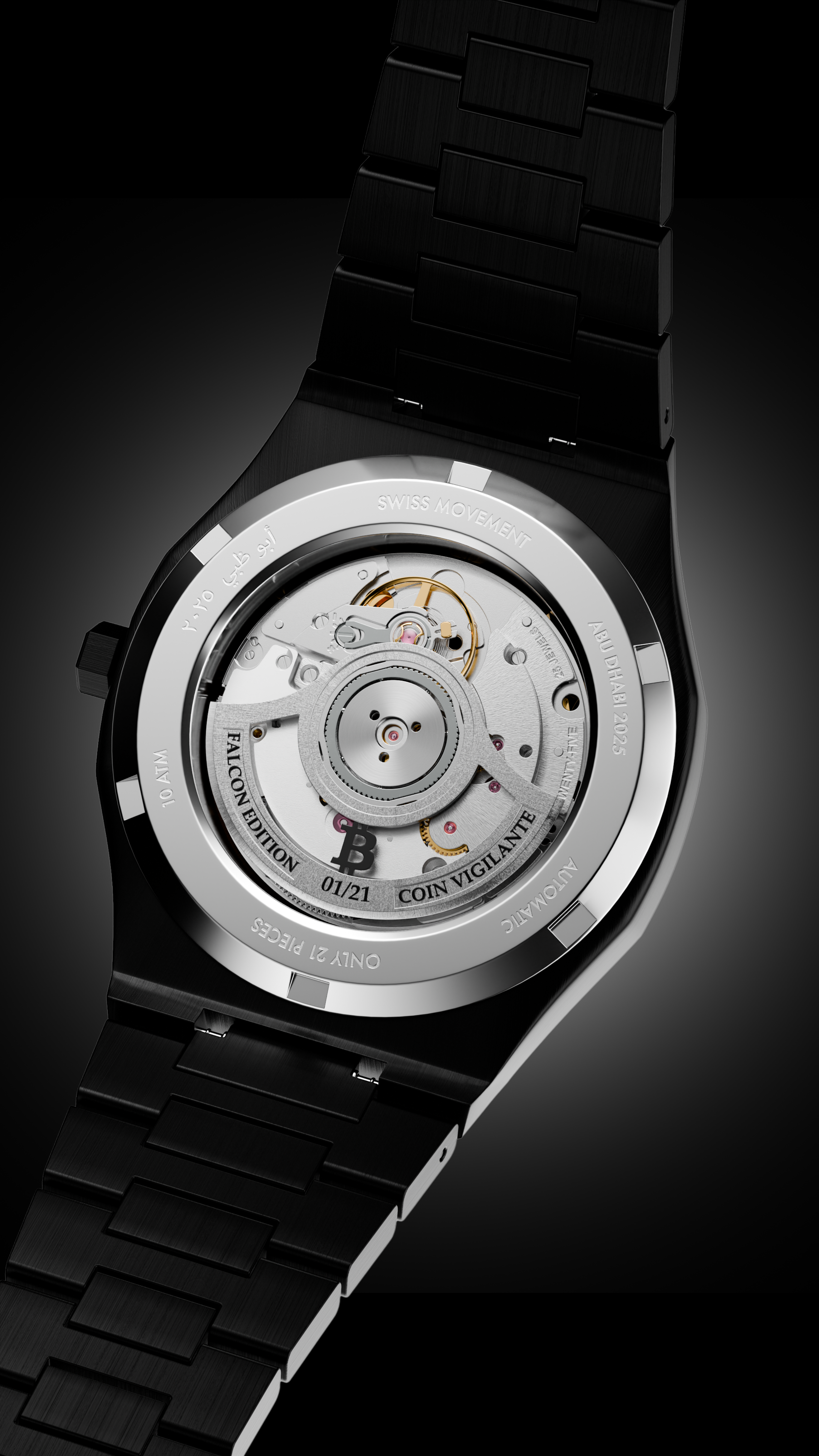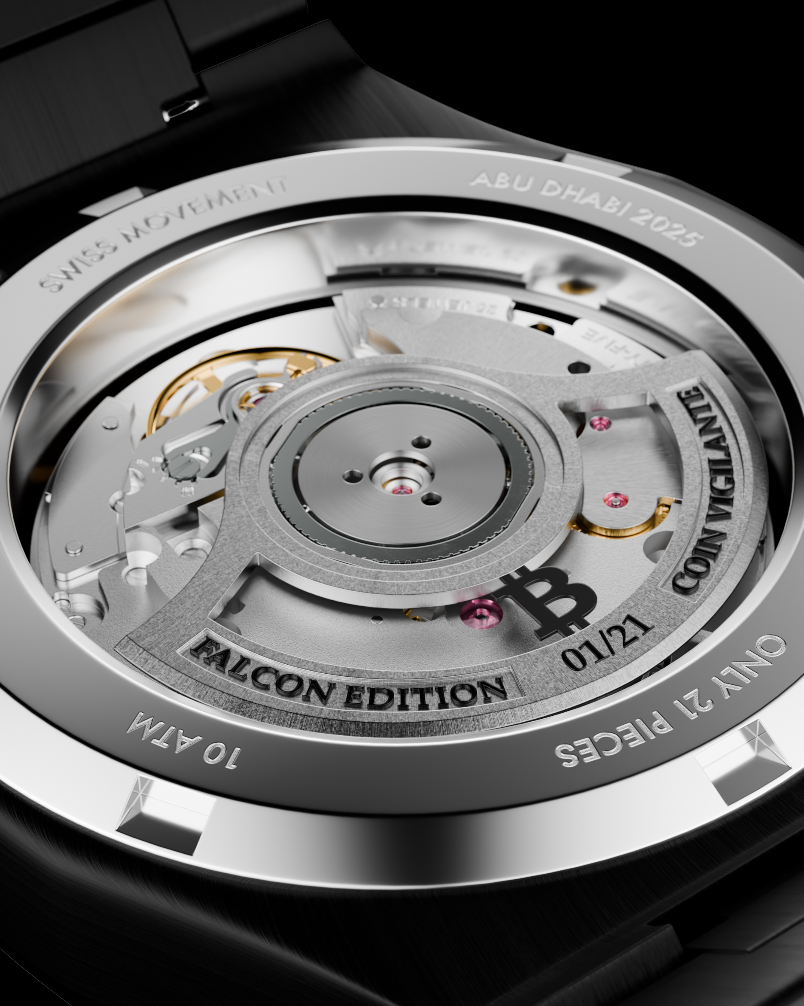 The Falcon marks Coin Vigilante’s first integration of a Swiss mechanical movement — chosen for its precision, reliability, and longevity.