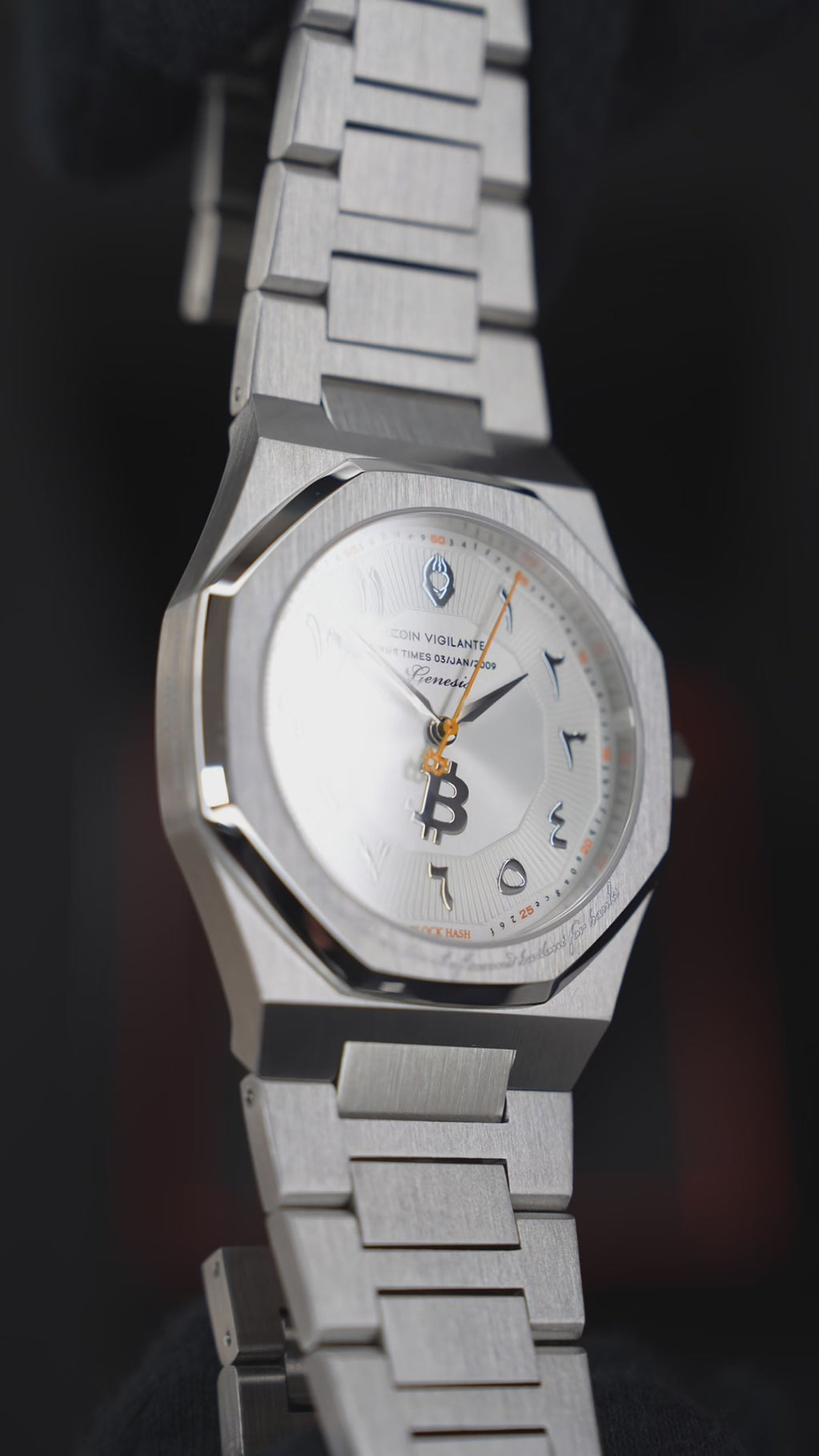 A limited Genesis-family release premiered in Abu Dhabi, the Nova blends symbolic heritage with regional influence. Featuring a striking white dial, polished silver accents, and Arabic-inspired numerals, it reflects both Bitcoin’s origin and its global reach.