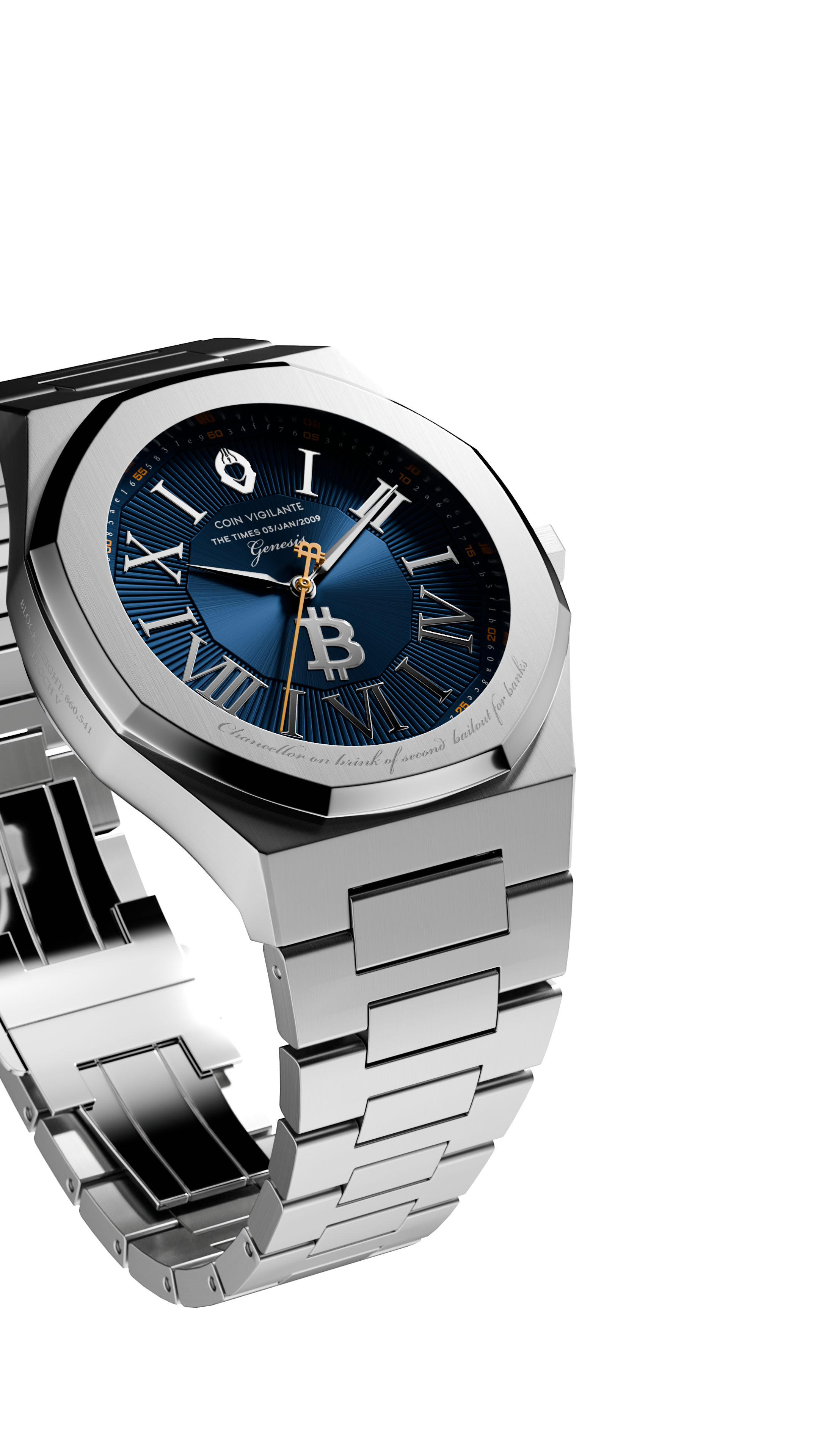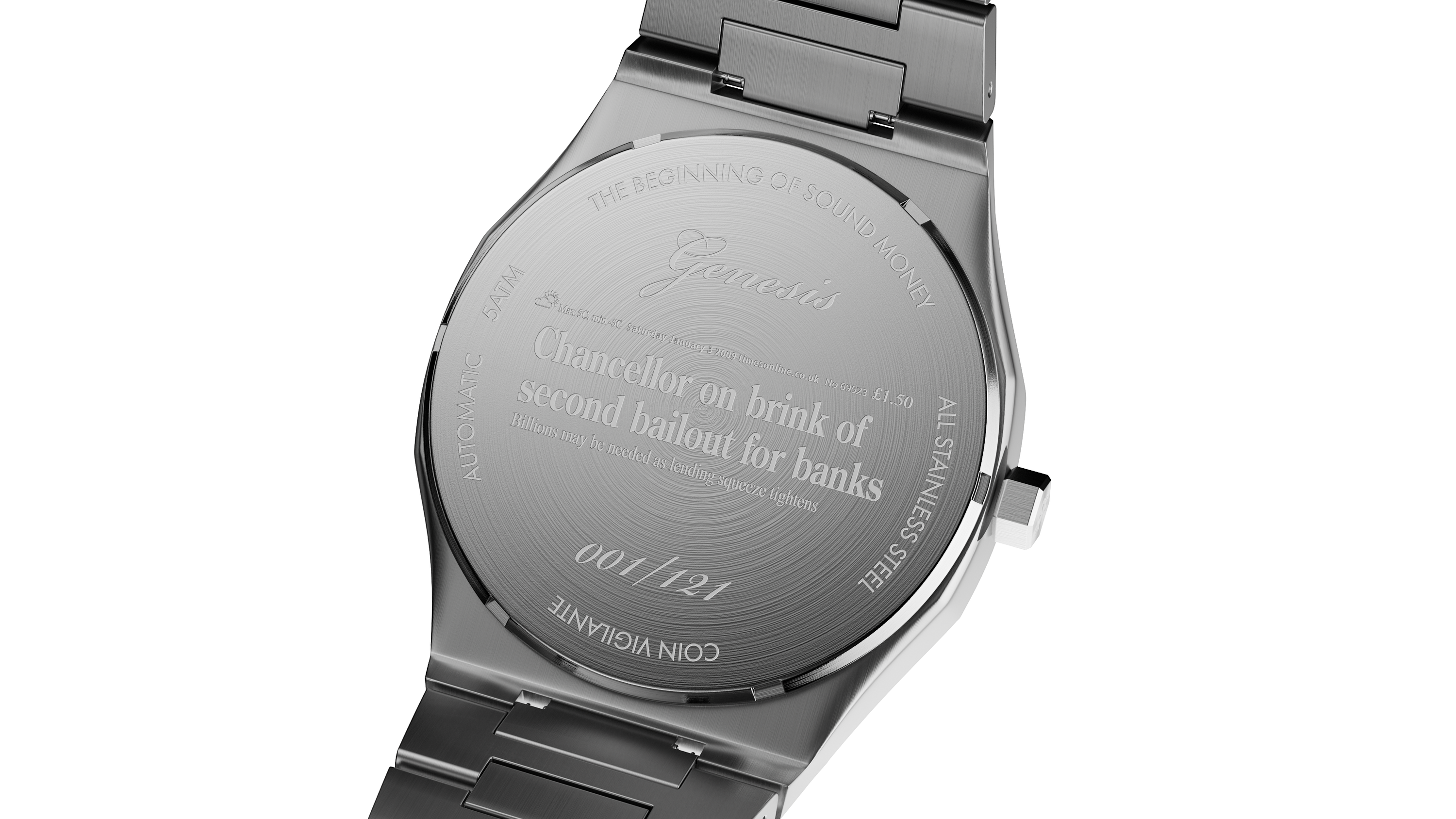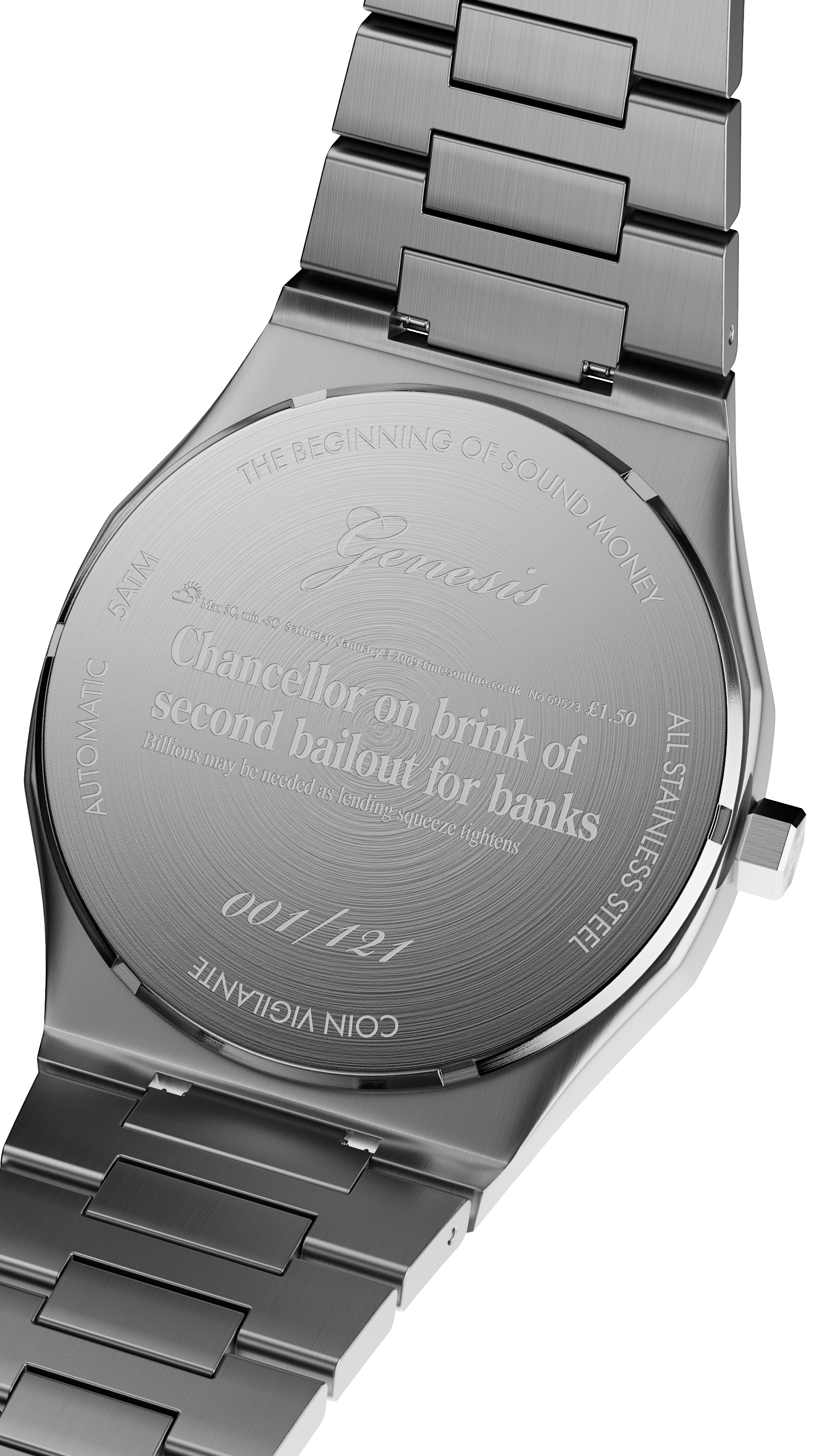 This iconic message, embedded by Satoshi Nakamoto in the Genesis Block on Jan 3, 2009, and referencing a headline from The Times, is engraved on the bezel, symbolizing Bitcoin's mission as an alternative to traditional financial systems. For added authenticity, the caseback features an incredibly detailed engraving of a portion of the actual newspaper cover from that day, including fascinating details such as the weather and price of the paper itself.