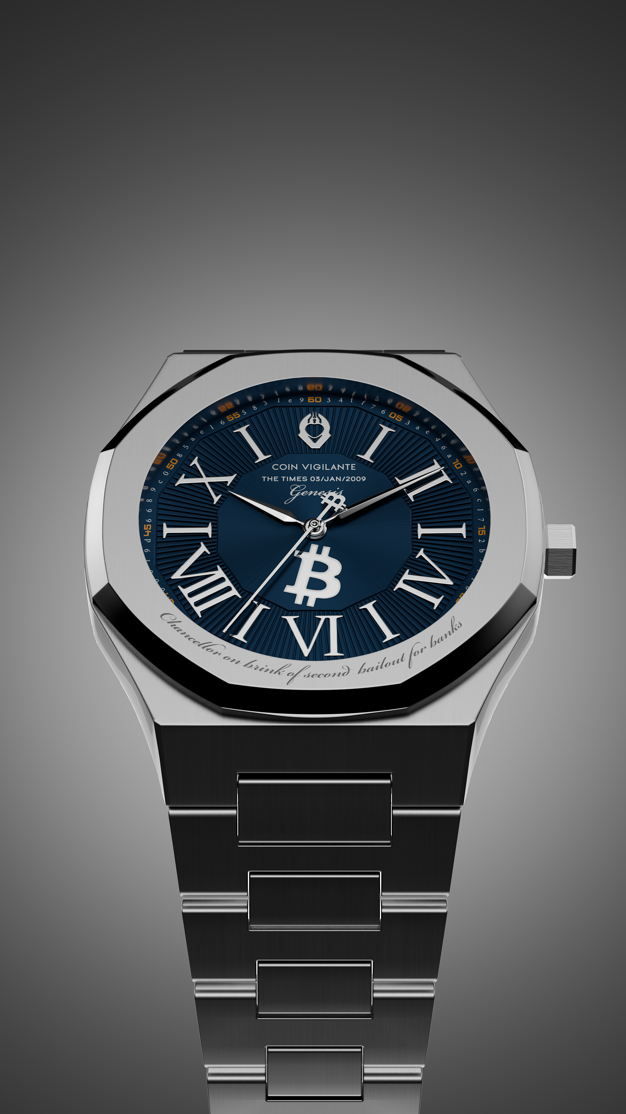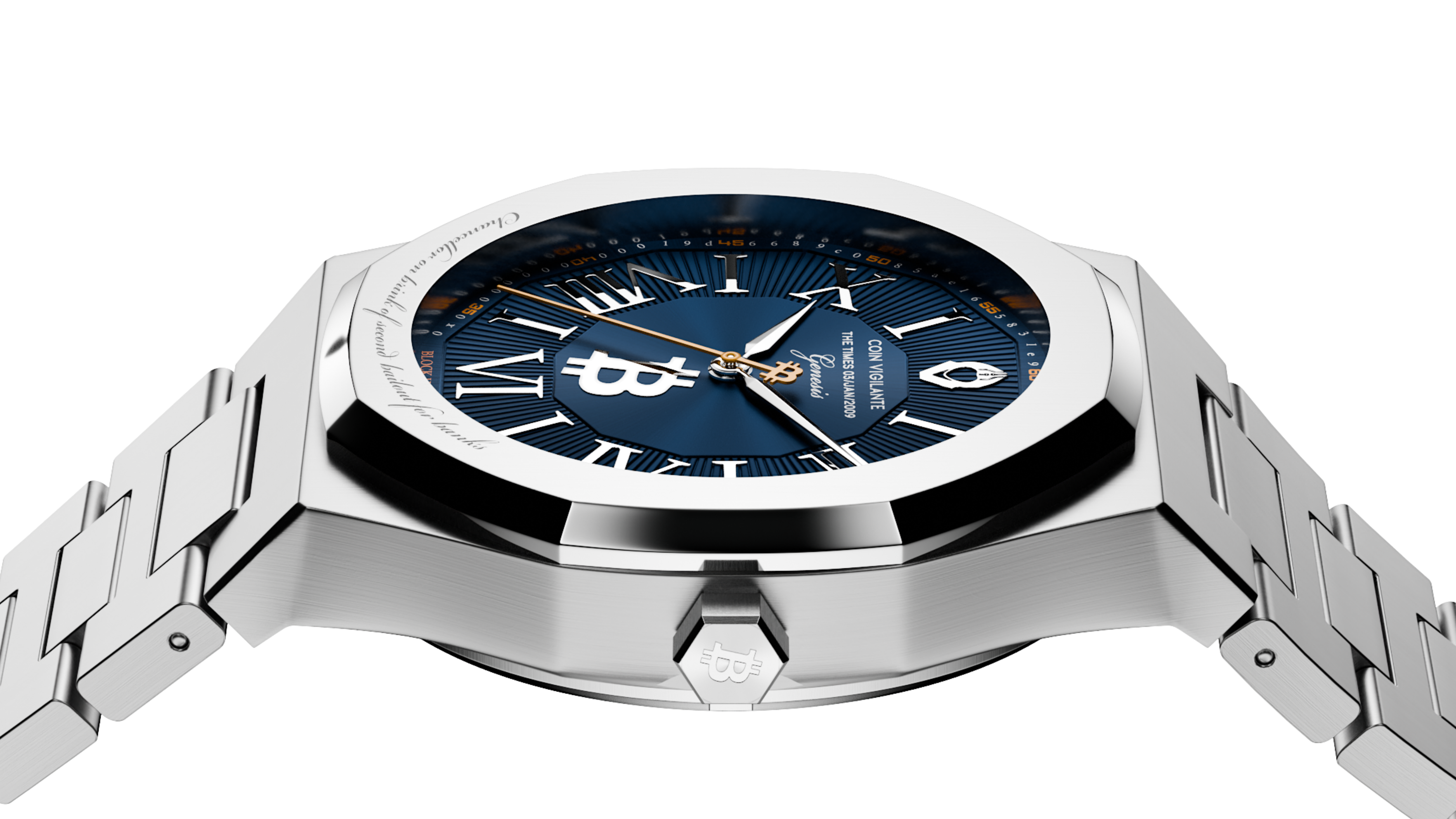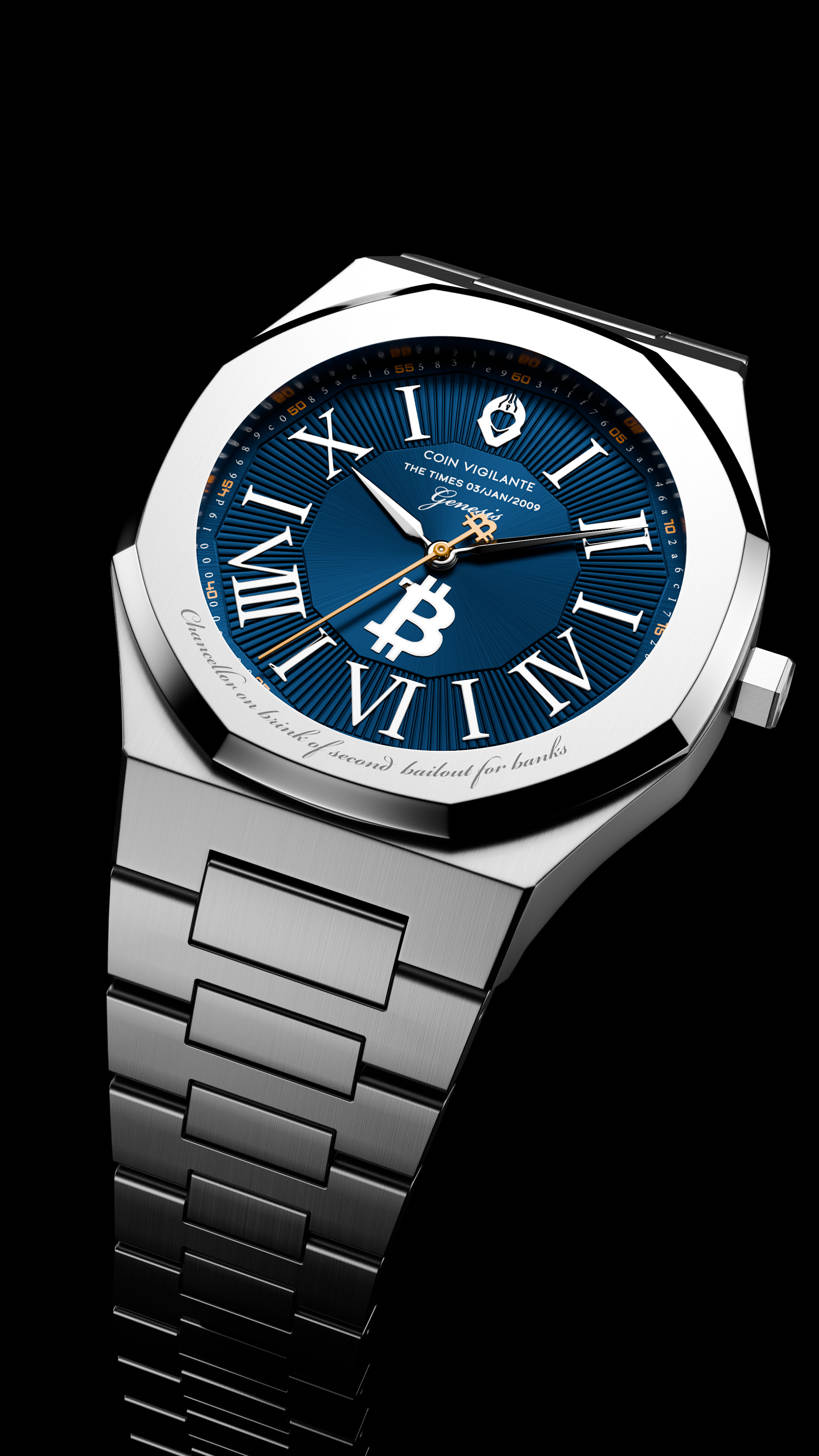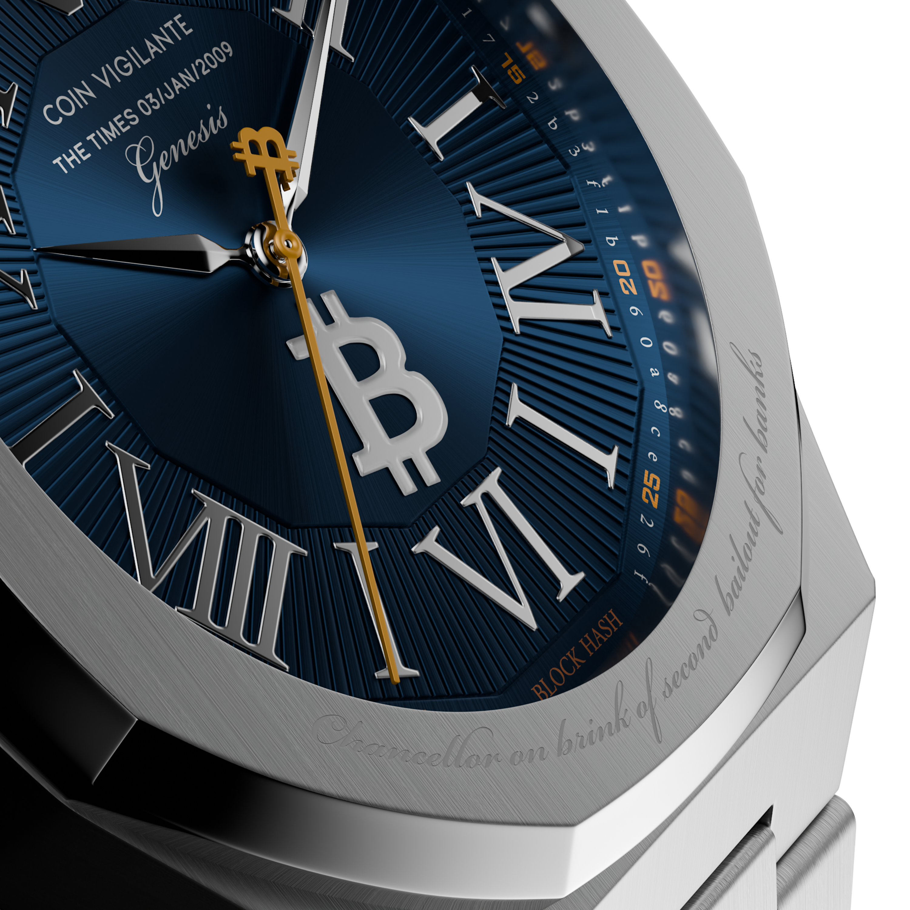 This iconic message, embedded by Satoshi Nakamoto in the Genesis Block on Jan 3, 2009, and referencing a headline from The Times, is engraved on the bezel, symbolizing Bitcoin's mission as an alternative to traditional financial systems. For added authenticity, the caseback features an incredibly detailed engraving of a portion of the actual newspaper cover from that day, including fascinating details such as the weather and price of the paper itself.