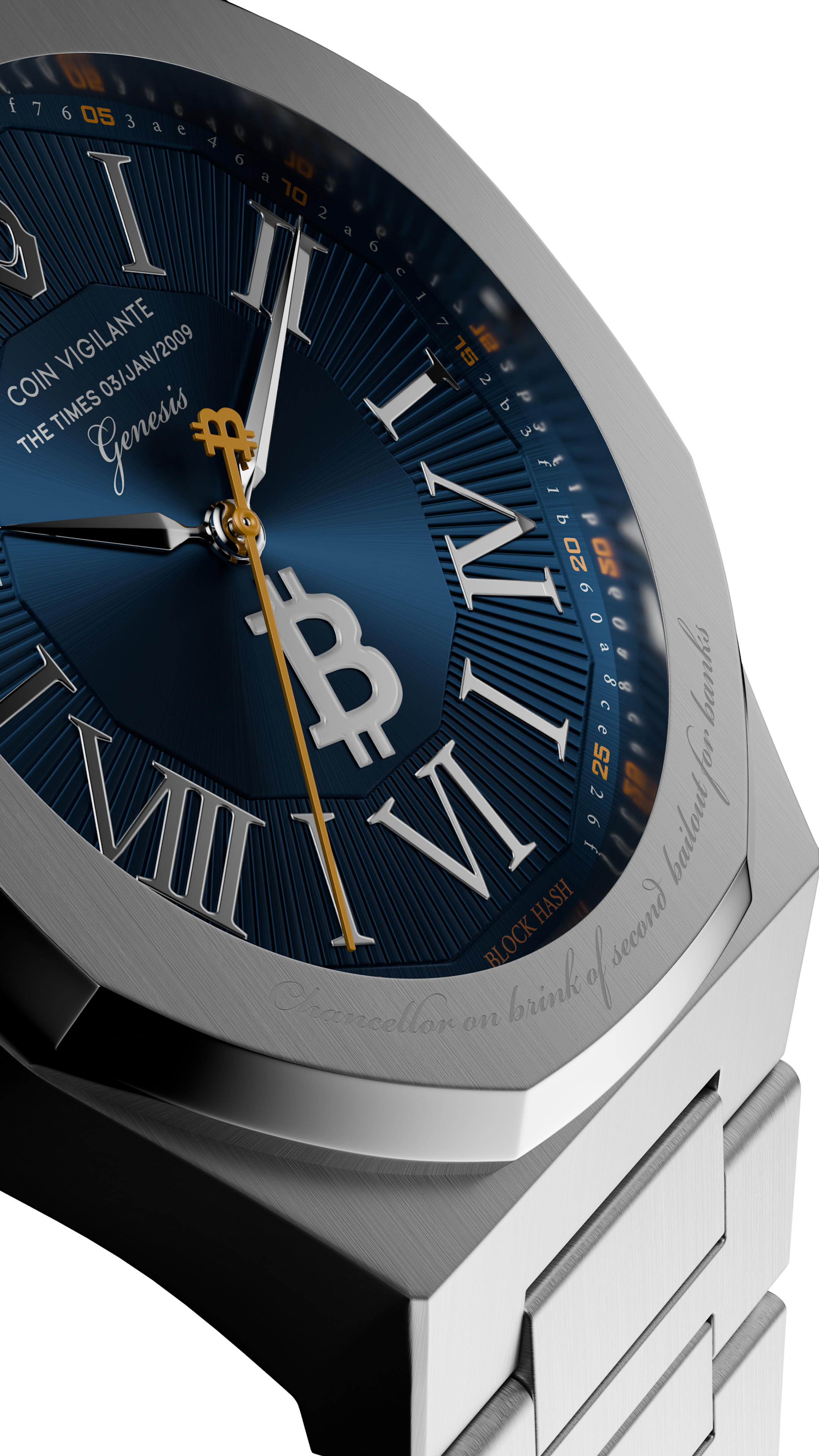 Featured around the watch are truly unique details, such as the Genesis Block Hash, displayed where the minute markers traditionally are. This hash, a unique reference for the first block on the blockchain, can be used to find the Genesis Block in a blockchain explorer.