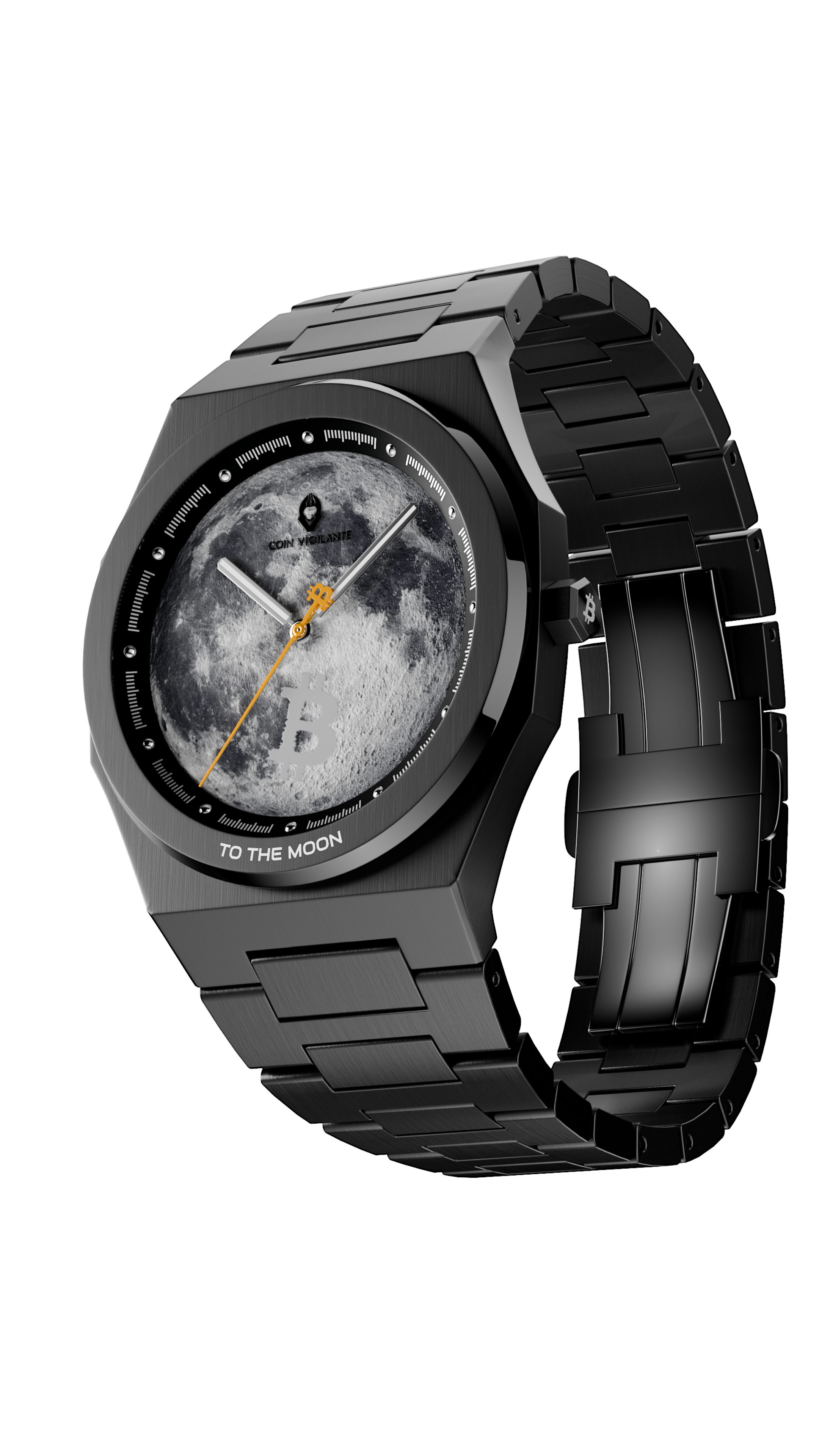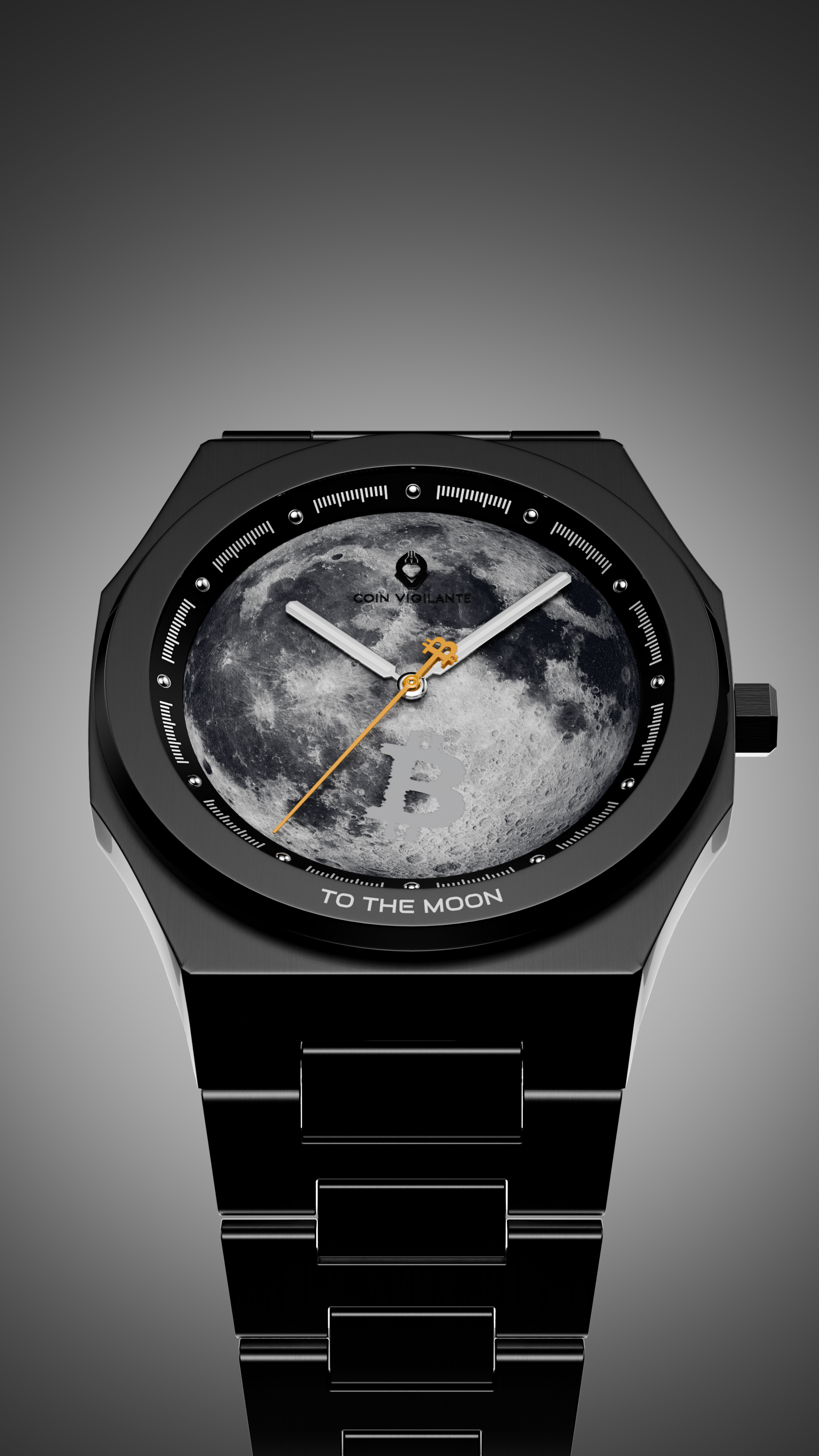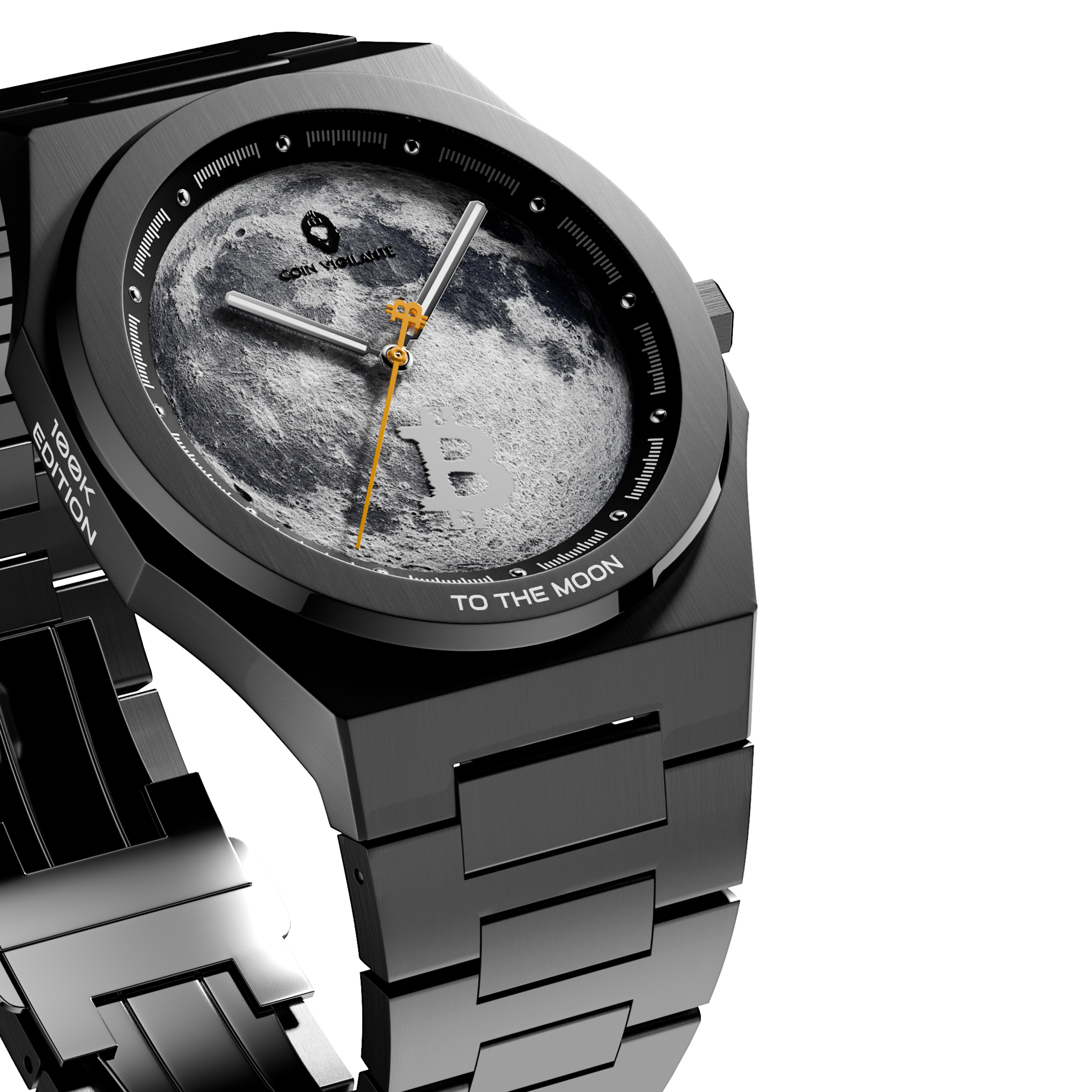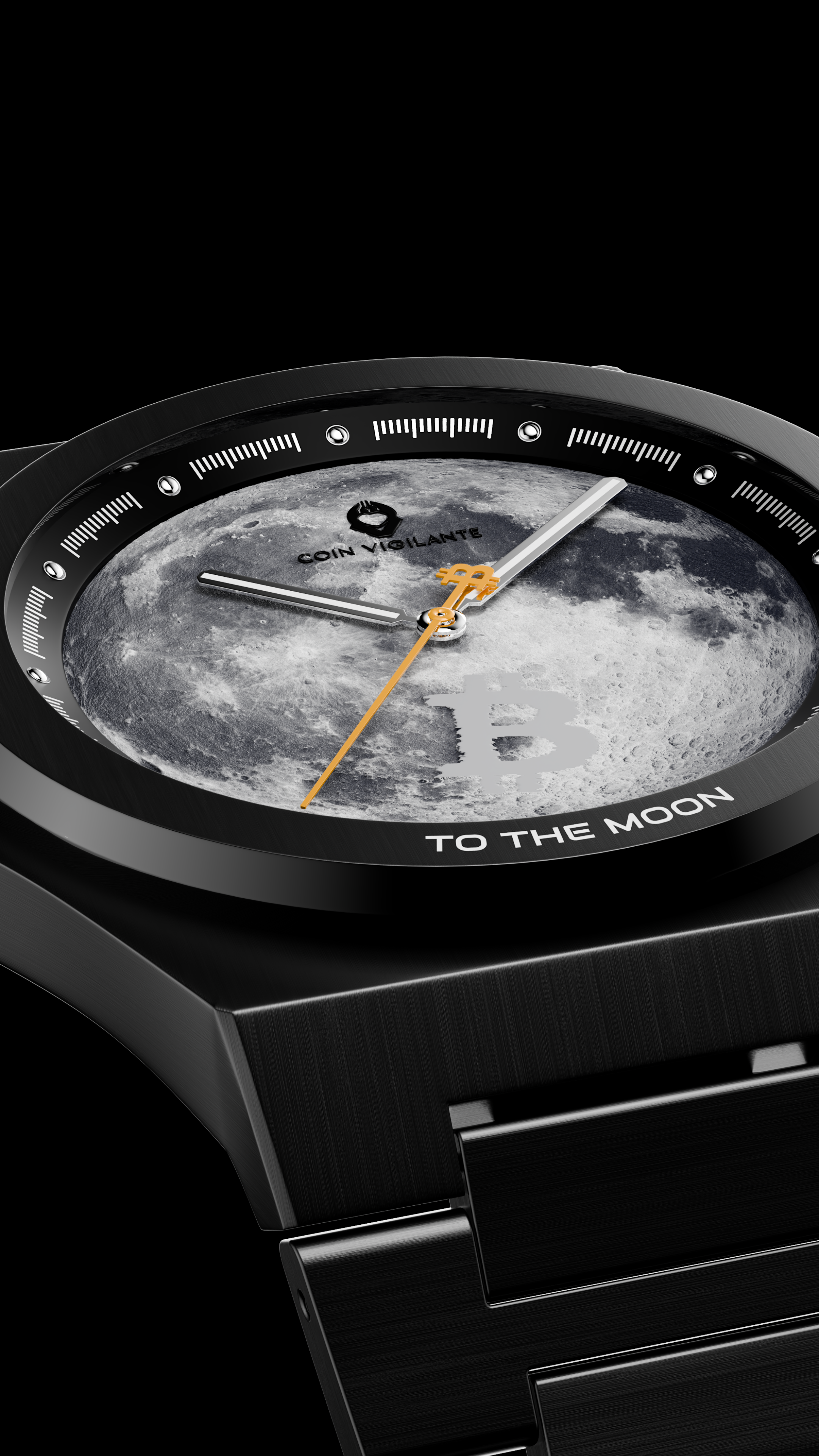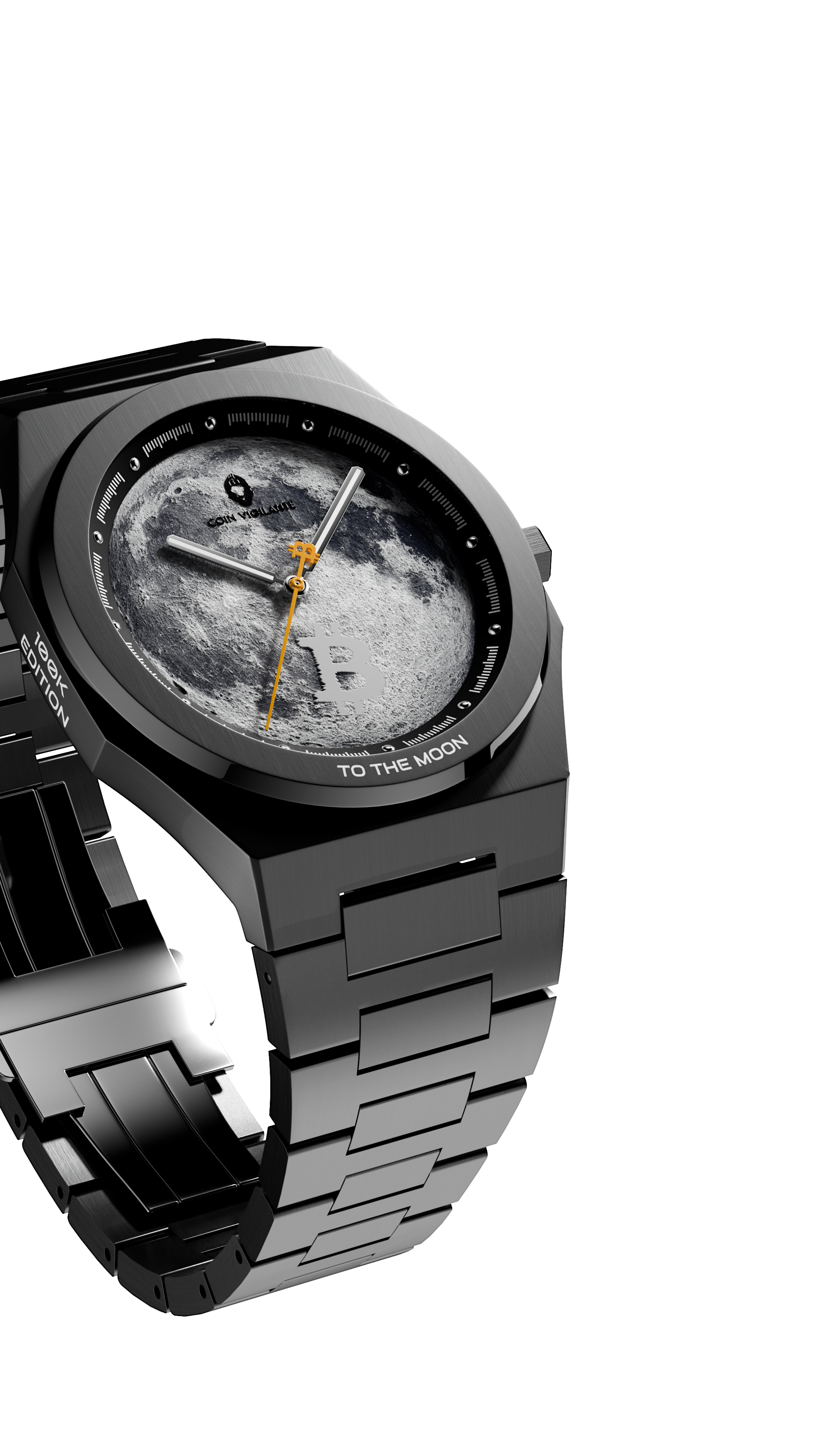 The stunning textured dial replicates the surface of the moon in astonishing detail, bringing the moon to life on your wrist. Engraved on the moon is theBitcoin “B” logo, symbolizing that Bitcoin has truly "landed" on the moon.