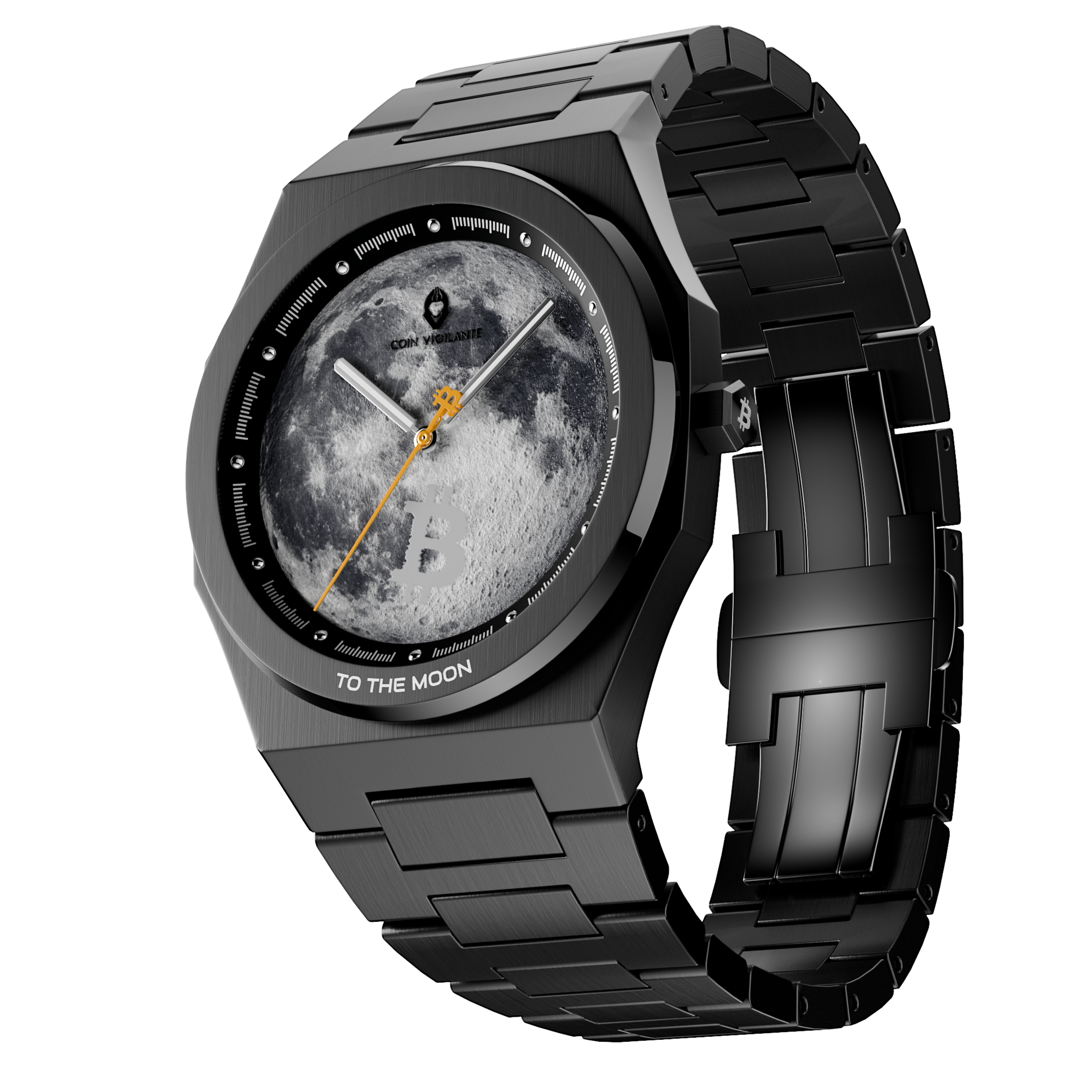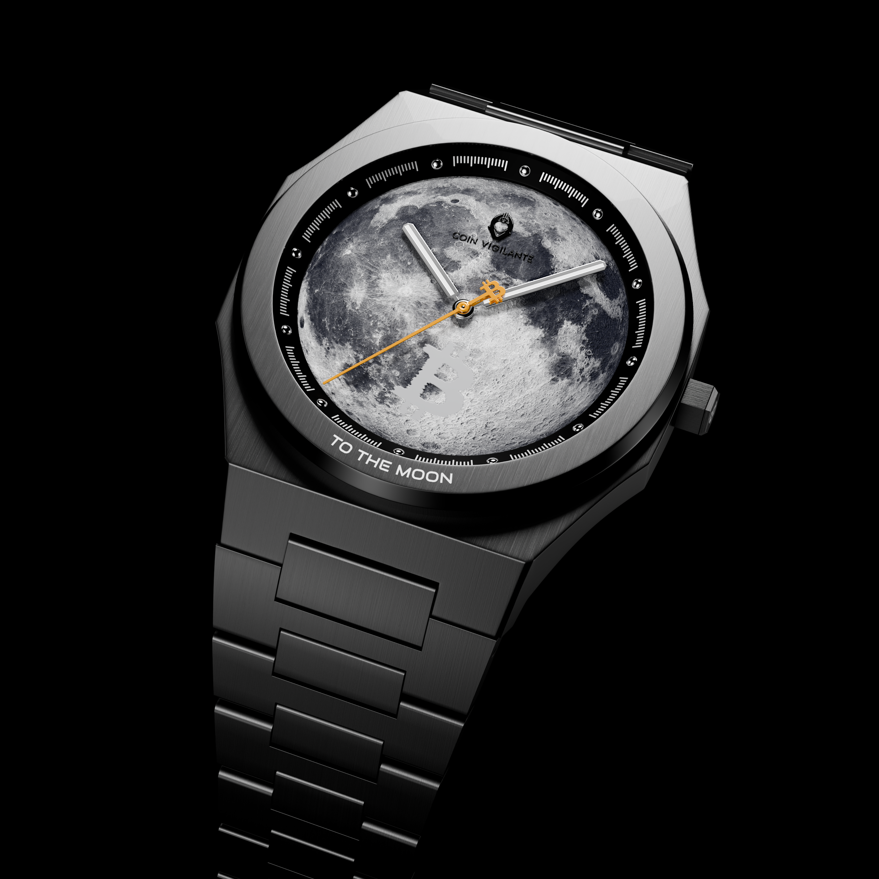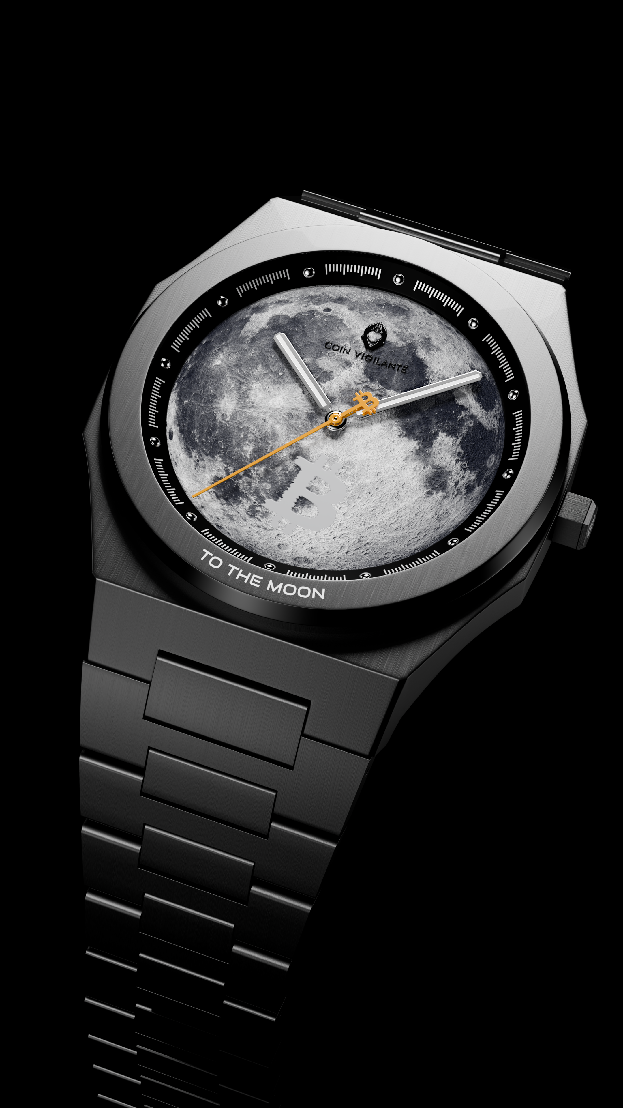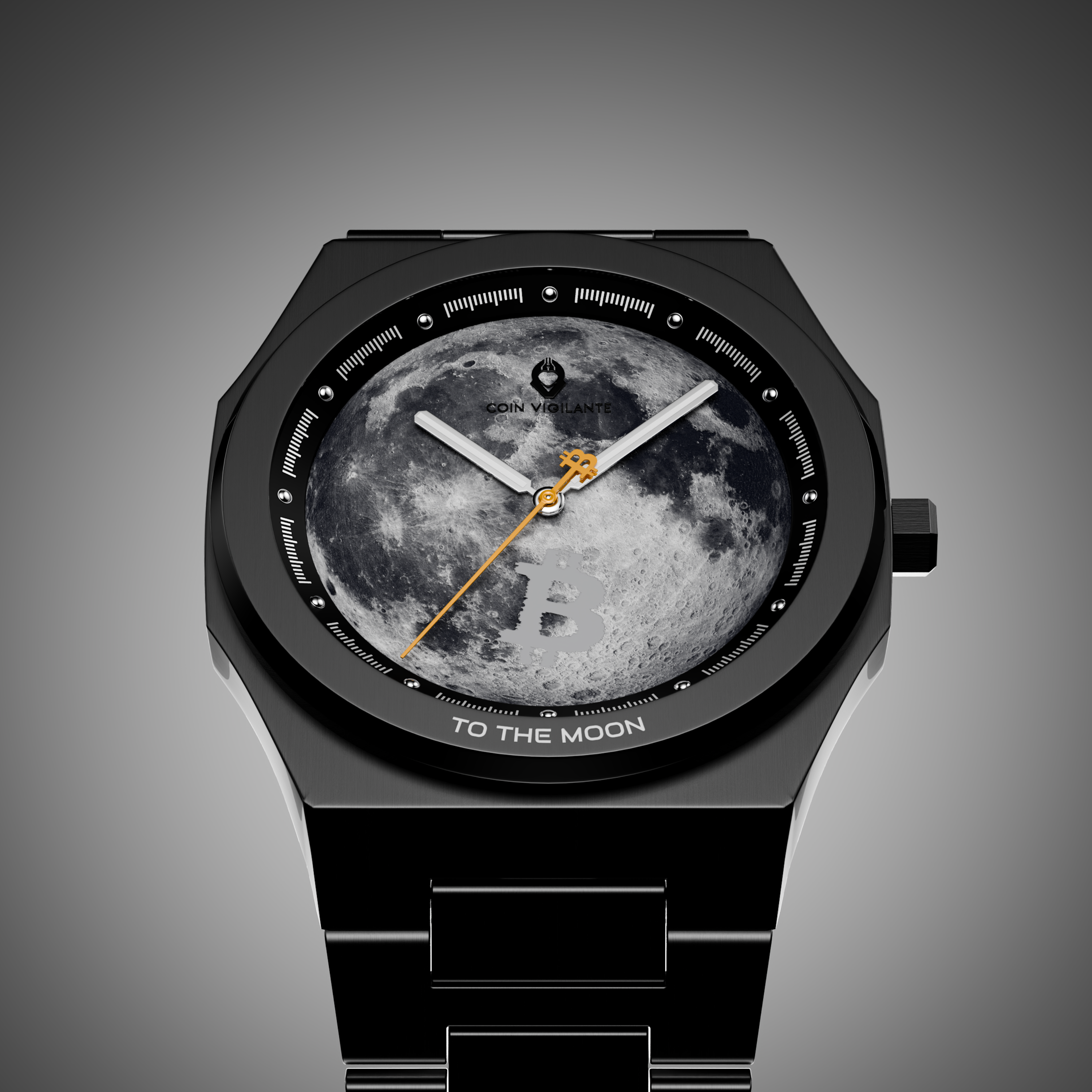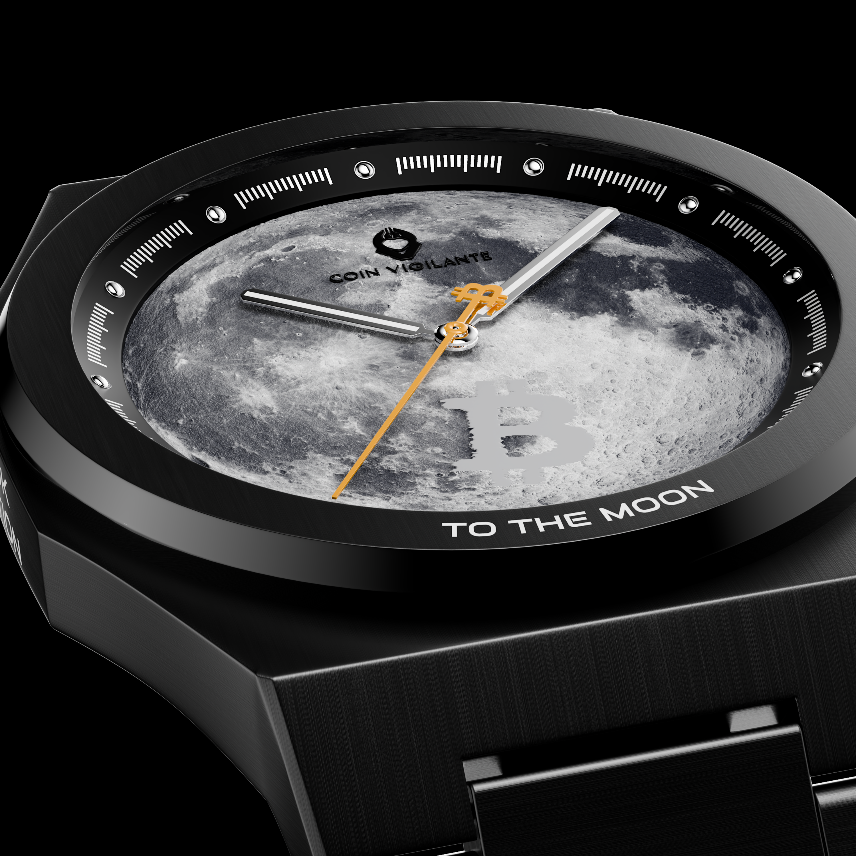 The stunning textured dial replicates the surface of the moon in astonishing detail, bringing the moon to life on your wrist. Engraved on the moon is theBitcoin “B” logo, symbolizing that Bitcoin has truly "landed" on the moon.
