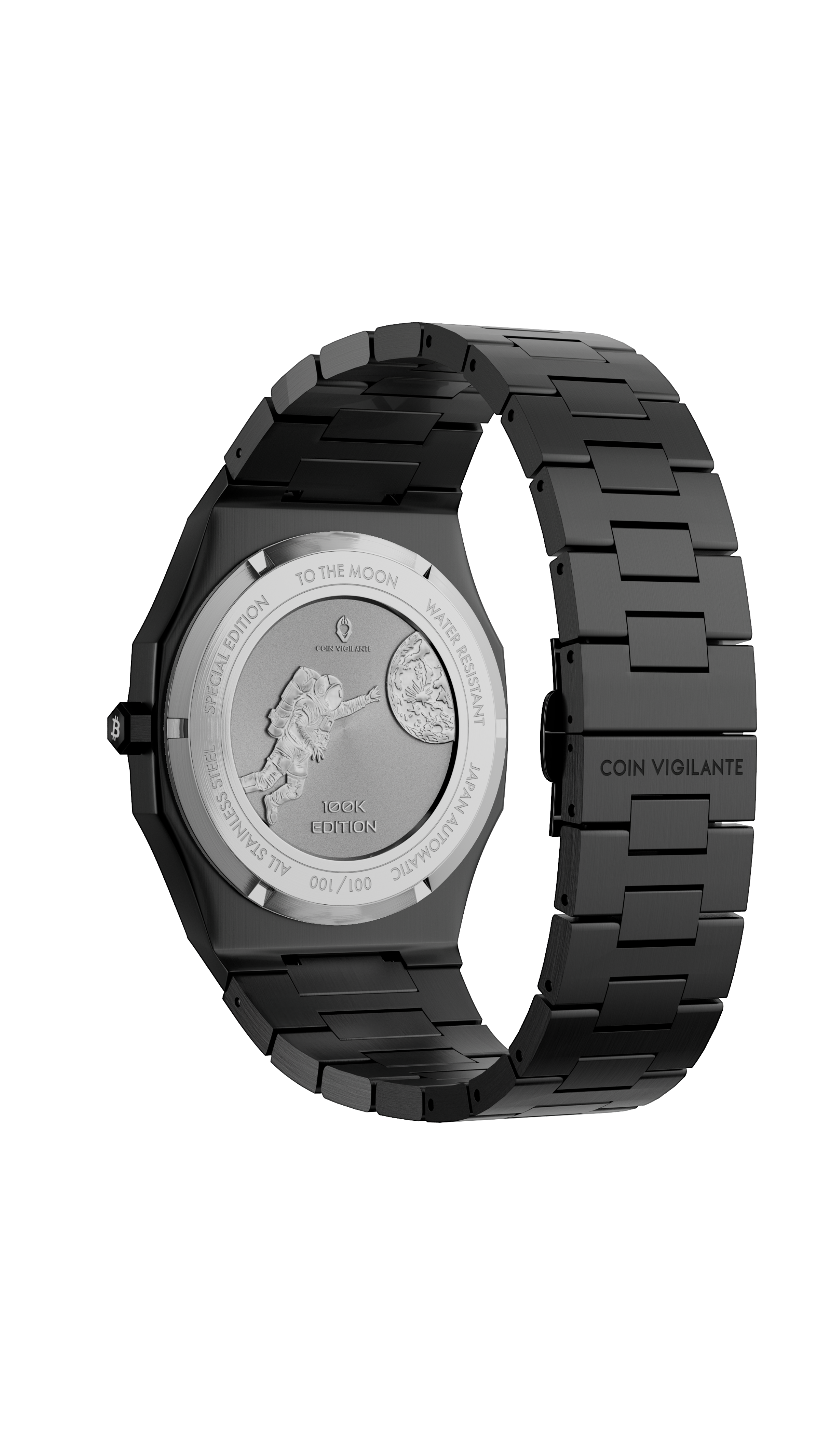 - Caseback Artistry: The caseback is a breathtaking showcase of craftsmanship, featuring a 3D oil-pressed design of an astronaut extending their left hand toward the moon. This powerful imagery not only symbolizes the collective ambition of the Bitcoin community but also reflects the wearer’s own journey, resilience, and aspirations. To the right of the caseback, the moon stands as a beacon of achievement and possibility. Encircling the design are the engraved phrases “TO THE MOON” and “100K Edition,” commemorating this incredible milestone in history—and the journey to get there.