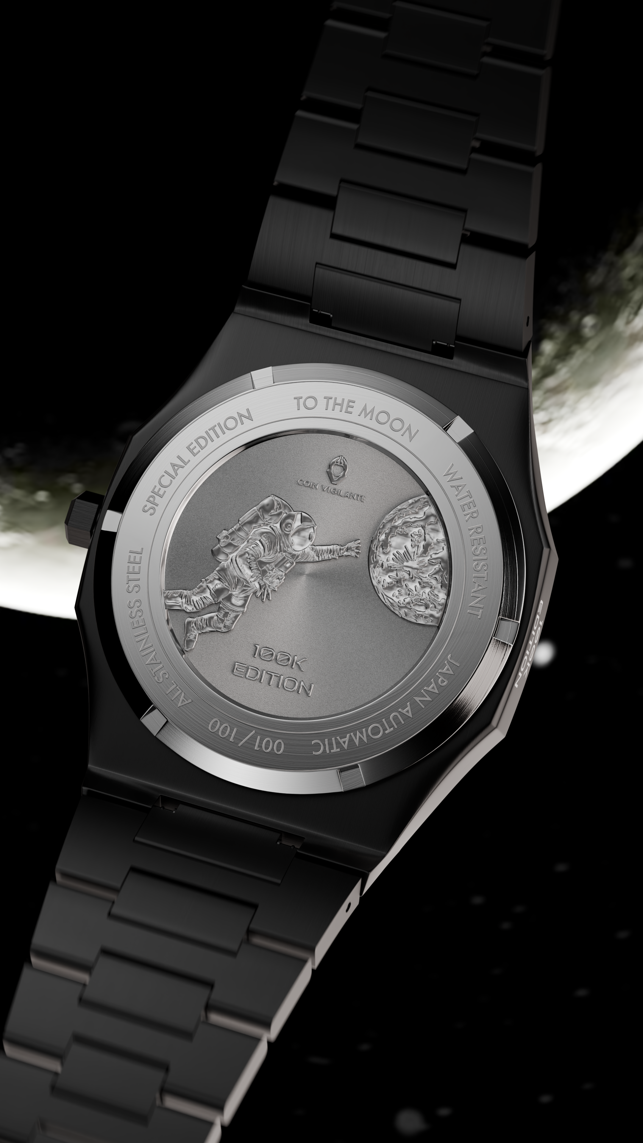 The TO THE MOON - 100K Edition Watch is a masterclass in design and symbolism, featuring:
