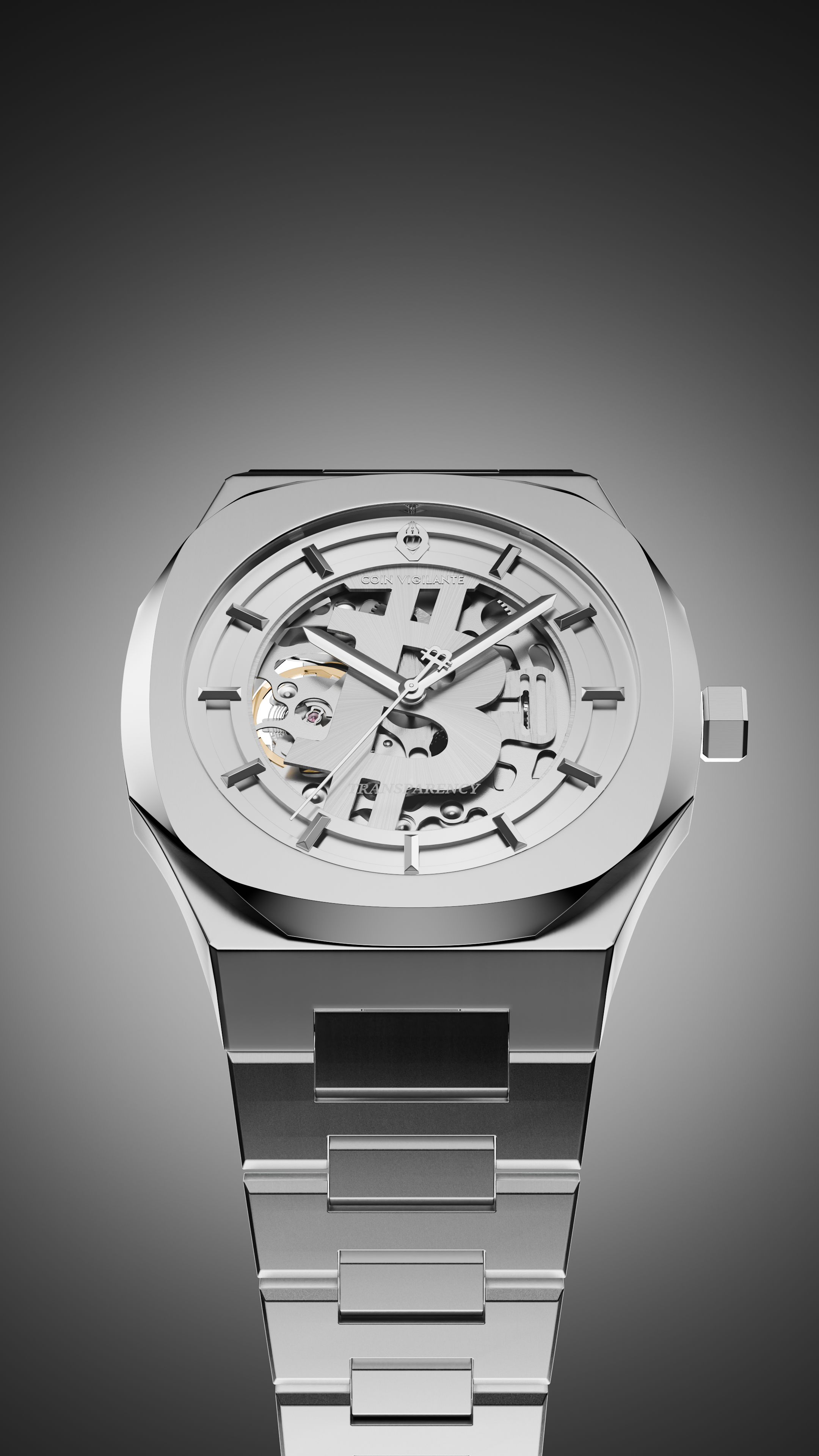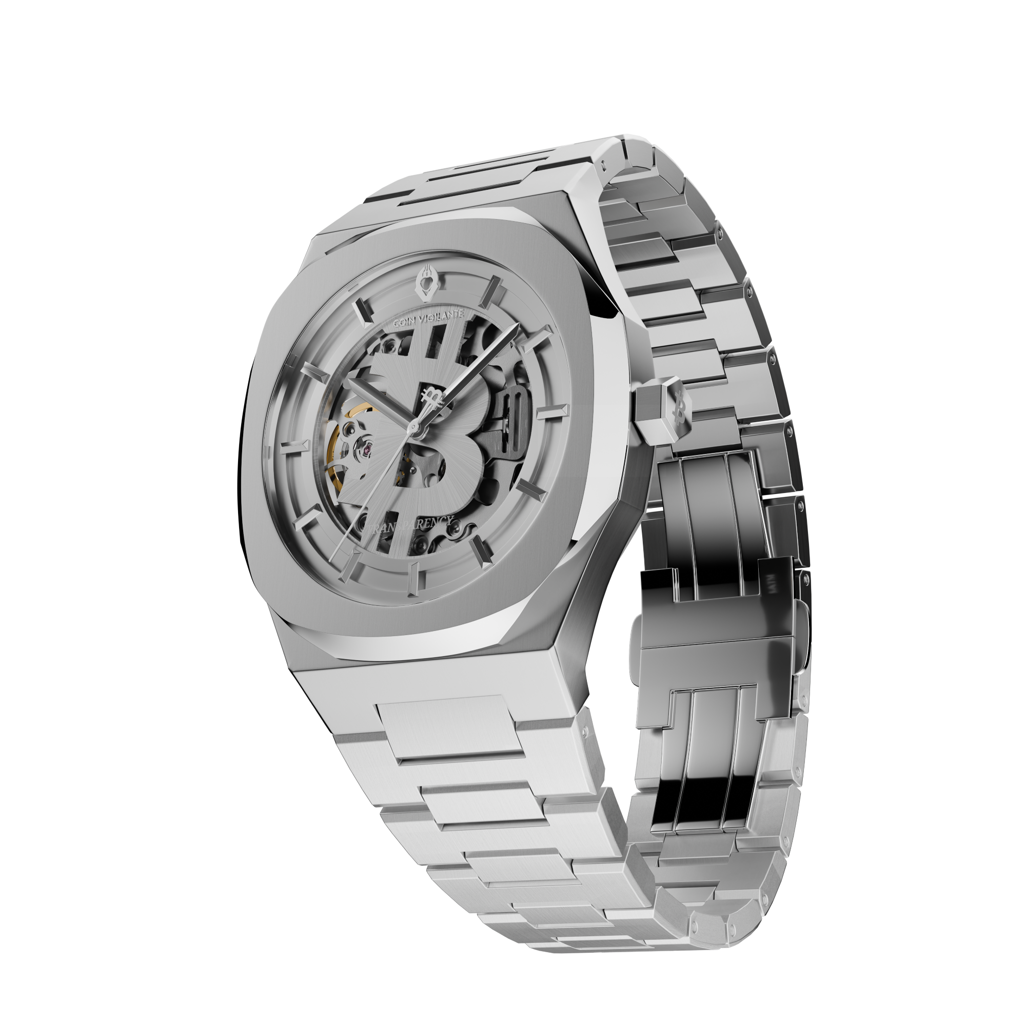 Crafted in an all-silver case and beautiful white sunray dial, this exclusive watch is produced on a very limited basis. The dial features a mesmerizing all-white Bitcoin logo in a stunning skeleton design, offering a glimpse into the intricate automatic movement - symbolizing Bitcoin's transparency. The silver seconds hand, adorned with the Bitcoin logo, adds a striking contrast and elevates the uniqueness of this watch.